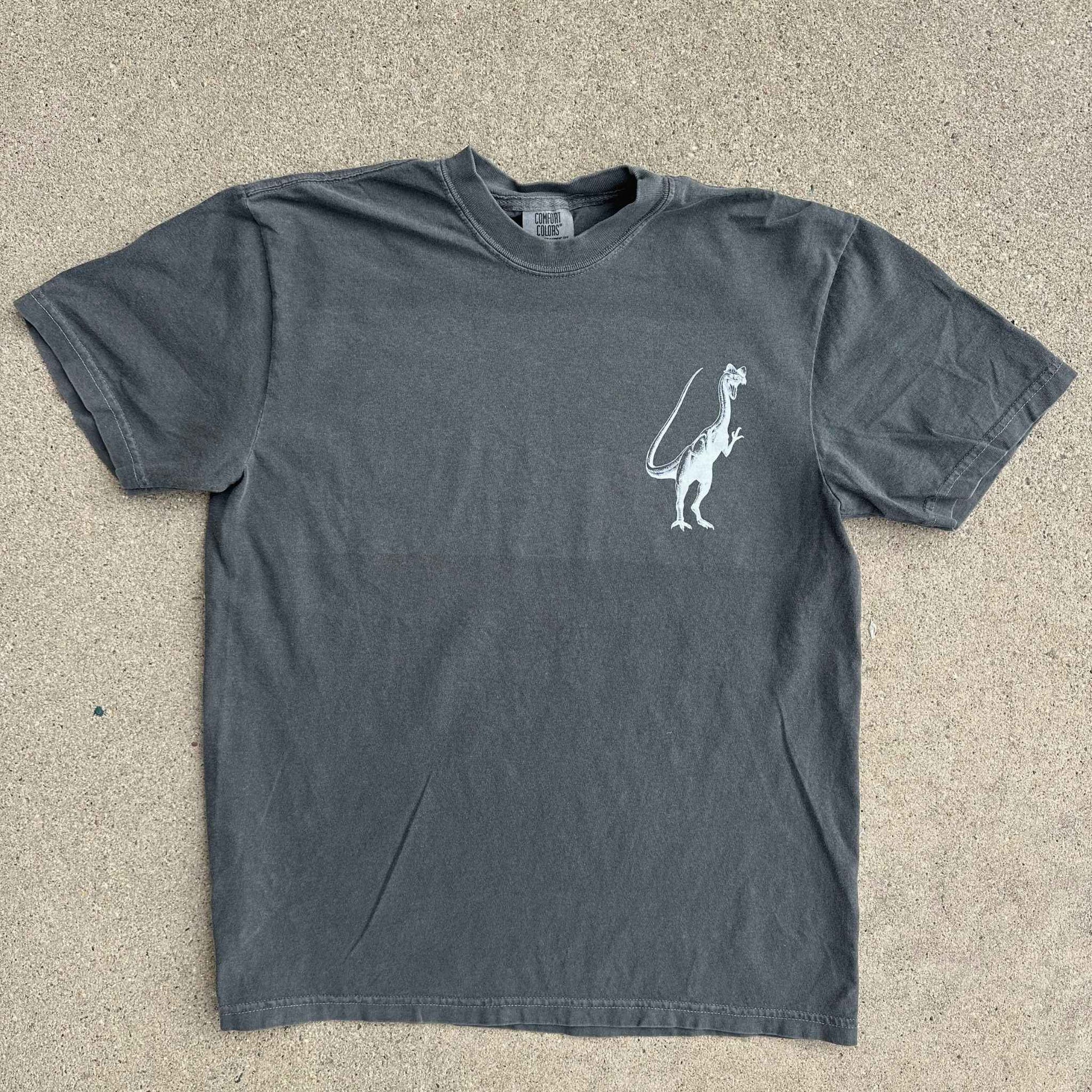 Not a guy you'd wanna be romping over the territory of, the dilophosaurus was a speedy hunter on a mission (don't get in the way, bestie!) This tee features art by the very talented Russell Hawley, artist and museum educator based in Casper, Wyoming! This design also shows the tracks of this incredible creature, with other info about its height, length, mass & running speed.